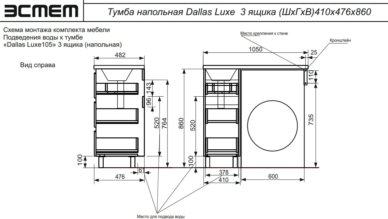 - Тумба с раковиной Dallas Luxe 1050 напольная 3 ящика левая