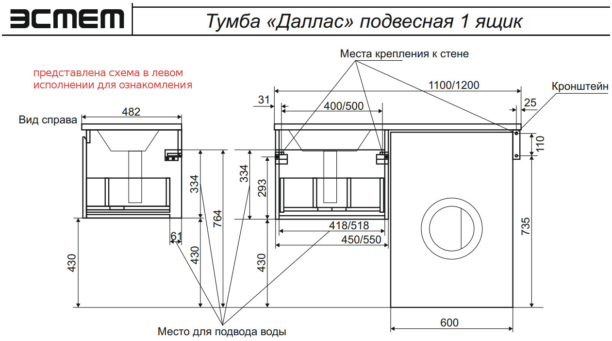Тумба с раковиной Dallas Luxe 1100 навесная 1 ящик правая
