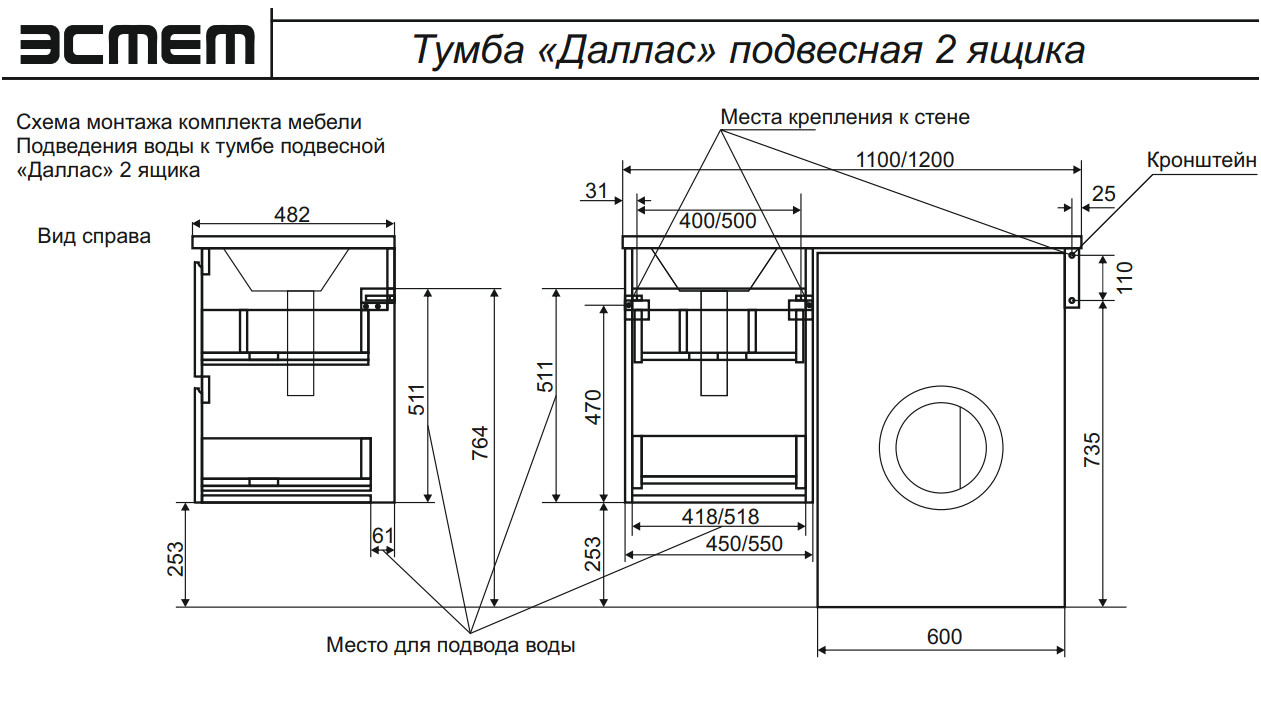 - Тумба с раковиной Dallas Luxe 1100 навесная 2 ящика левая