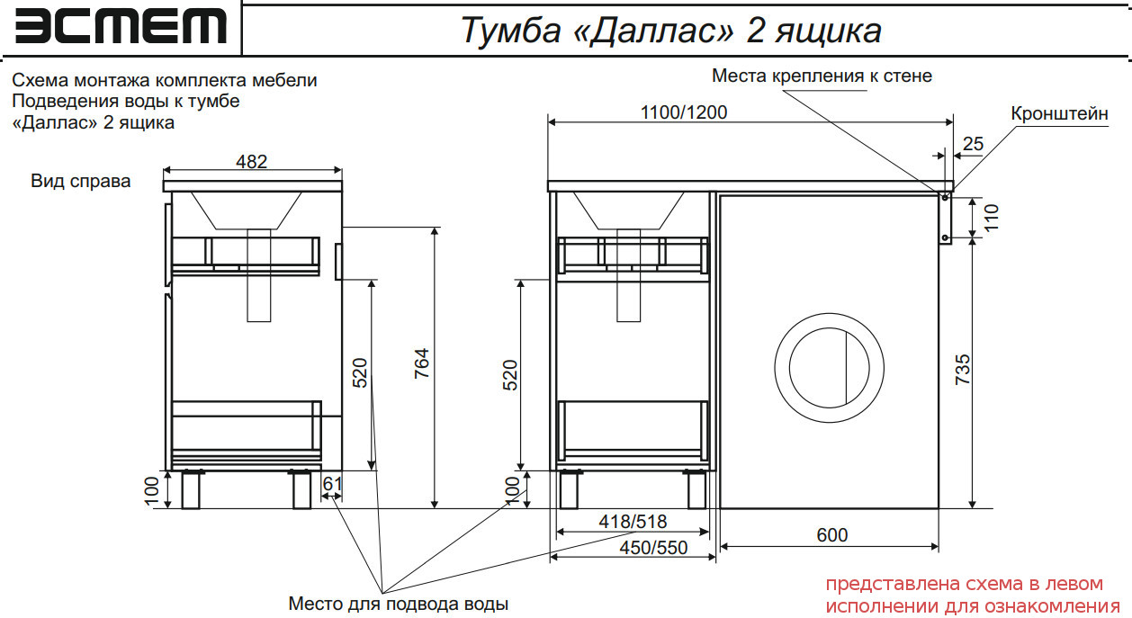 - Тумба с раковиной Dallas Luxe 1150 напольная 2 ящика правая