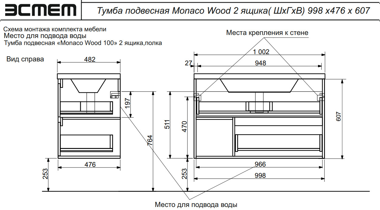 Тумба с раковиной Monaco Wood 1000 2 ящика с нишей