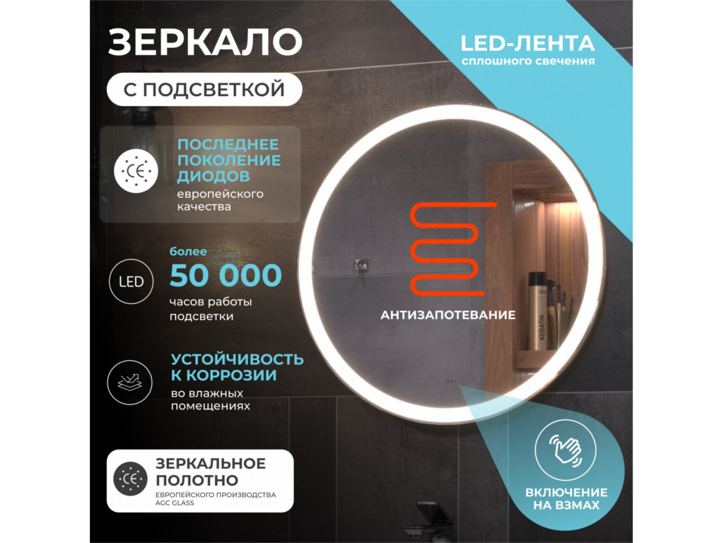 Подсветка фронтальная по периметру, с цветовой температурой 5000К – нейтральный белый, управление подсветкой бесконтактный выключатель «на взмах»