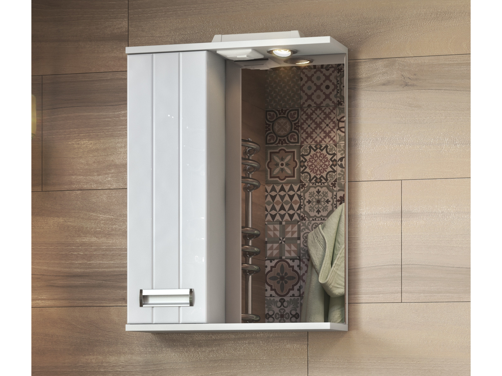 Оснащение: 1 дверца; 2 полки ЛДСП, 1 светодиодный светильник, включатель с розеткой; ручка врезная металлическая хромированная.