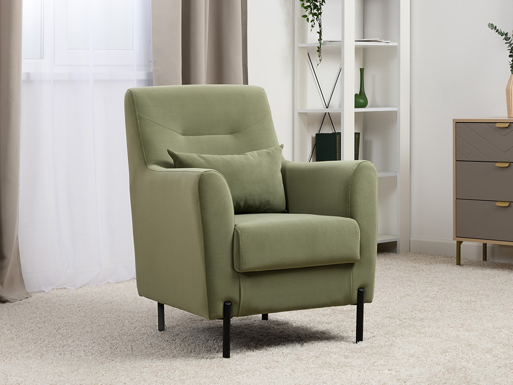 Декоративная утяжка на спинке кресла, декоративная подушка в цвете кресла, металлические опоры переходят в декоративный элемент подлокотника