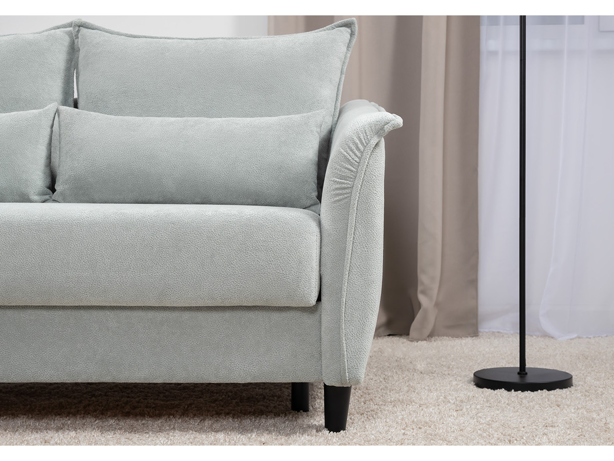 Спинка с тремя приспинными подушками. Две подушки трапецивидной формы, центральная квадратной формы на молнии, по трем сторонам которых проложена отделочная строчка на 1,2 см. По контуру боковин проложен декоративный кант на 1,2 см из основной ткани. Кант проходит по центру передней части боковины, а по внутренней верхней части сборка.