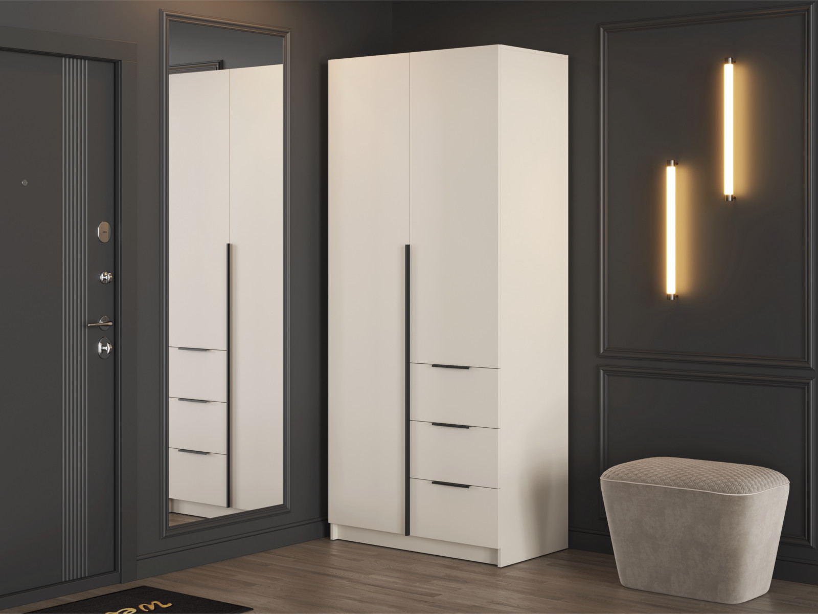 Дно ящиков – ХДФ простое (без цвета) – полностью накладное(набивное). - Также шкаф имеет две створки, за которыми расположены: