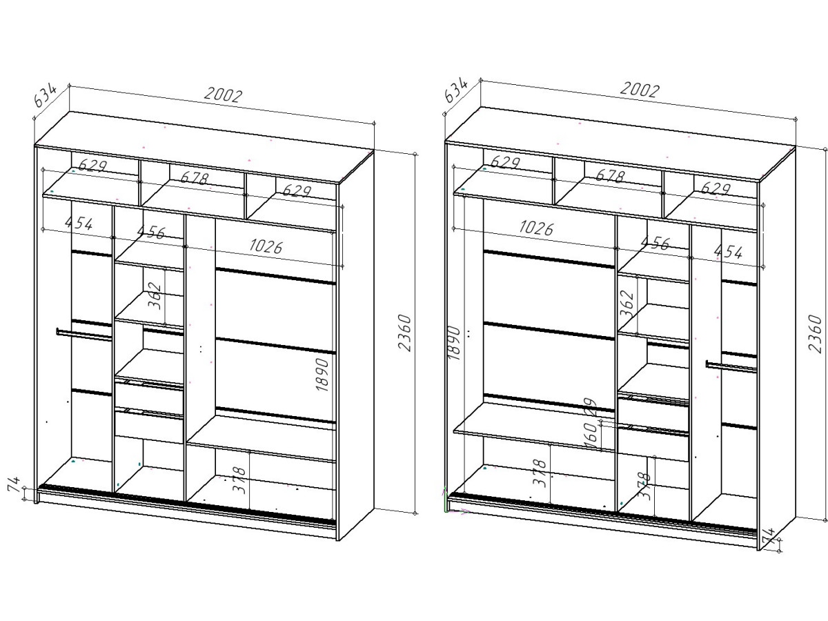 - Верхняя часть включает в себя 2 перегородки и состоит из 3х отсеков: центральный отсек габаритом Д.678 х В.348 х Г.522 мм, левый и правый отсеки равные по габариту Д.629 х В.348 х Г.522 мм.