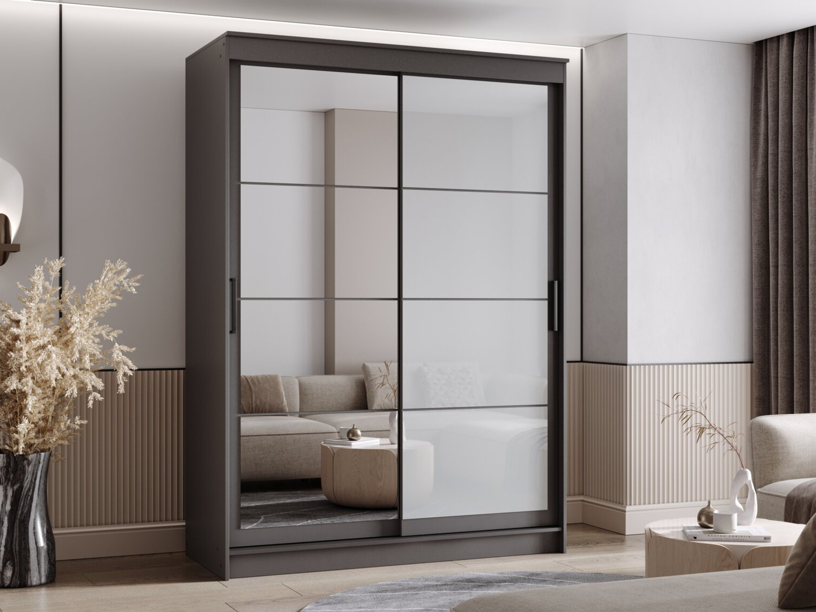 - Шкаф-купе Гранд-1 1600 Графит-двери Зеркало-Лакобель белый