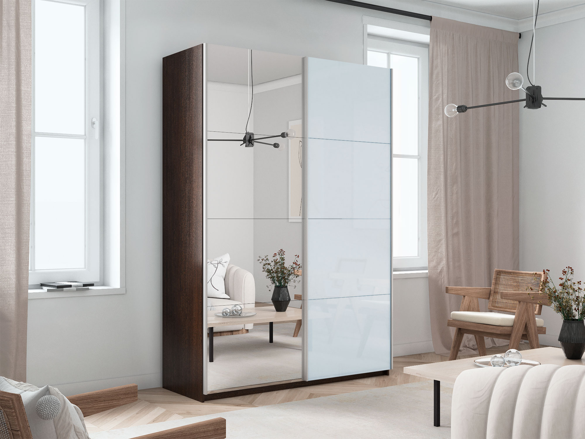 - Шкаф-купе Прайм 2-х дверный 1600 Зеркало/Стекло Белое Венге