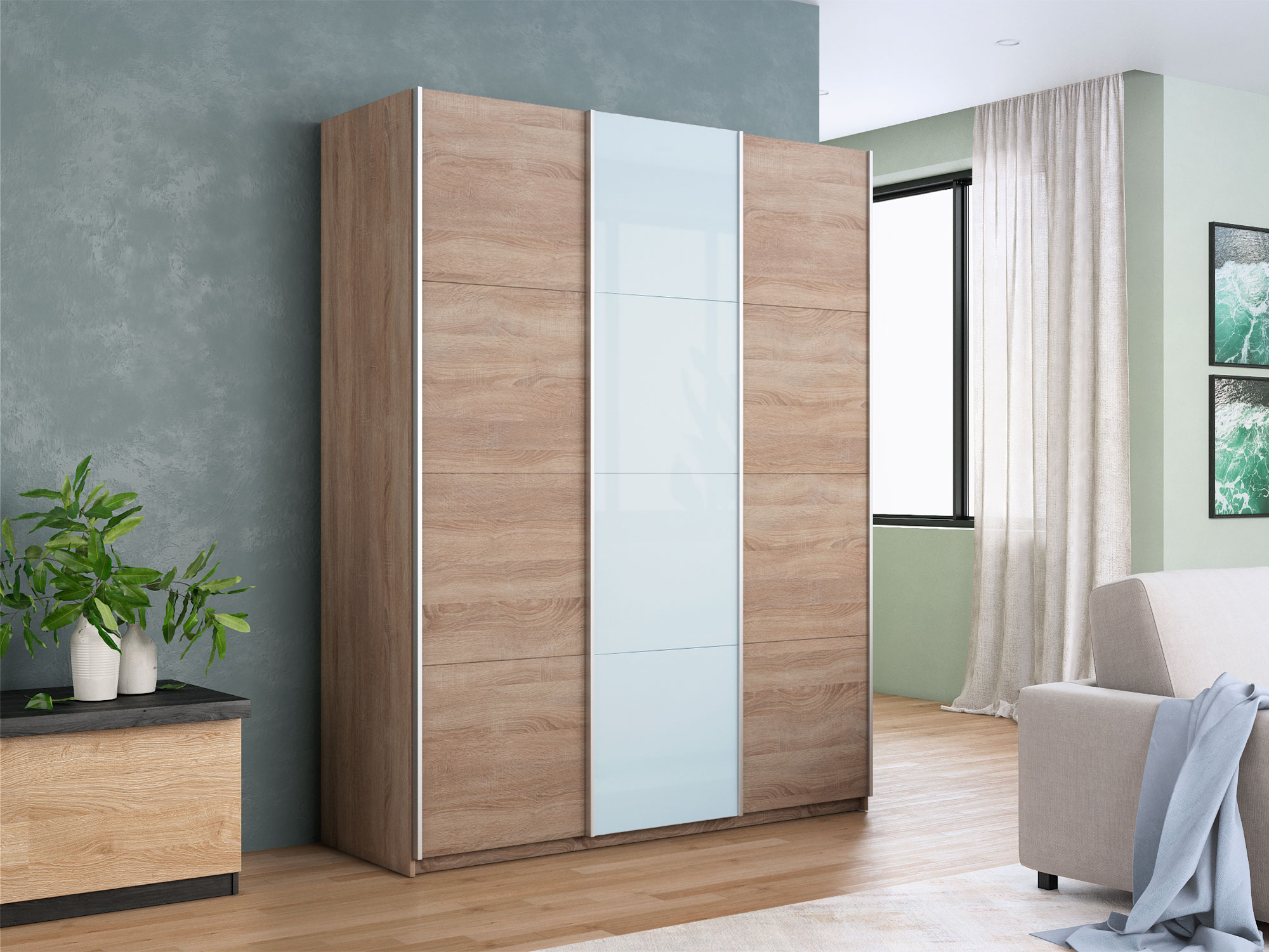 - Шкаф-купе Прайм 3-х дверный 1800 ДСП/Стекло Белое/ДСП Сонома