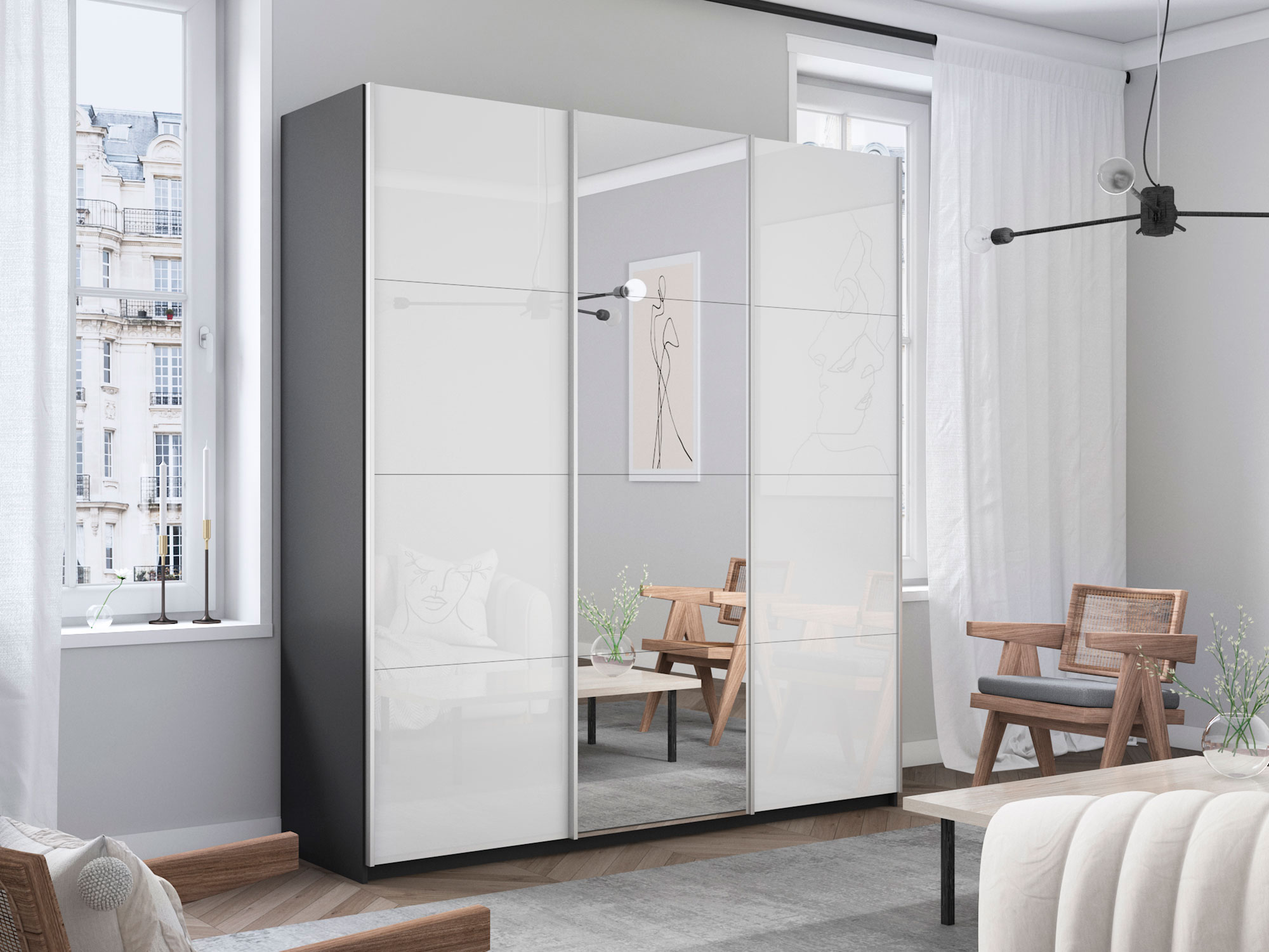 Шкаф-купе Прайм 3-х дверный 1800 два Стекла Белые/Зеркало Серый Диамант