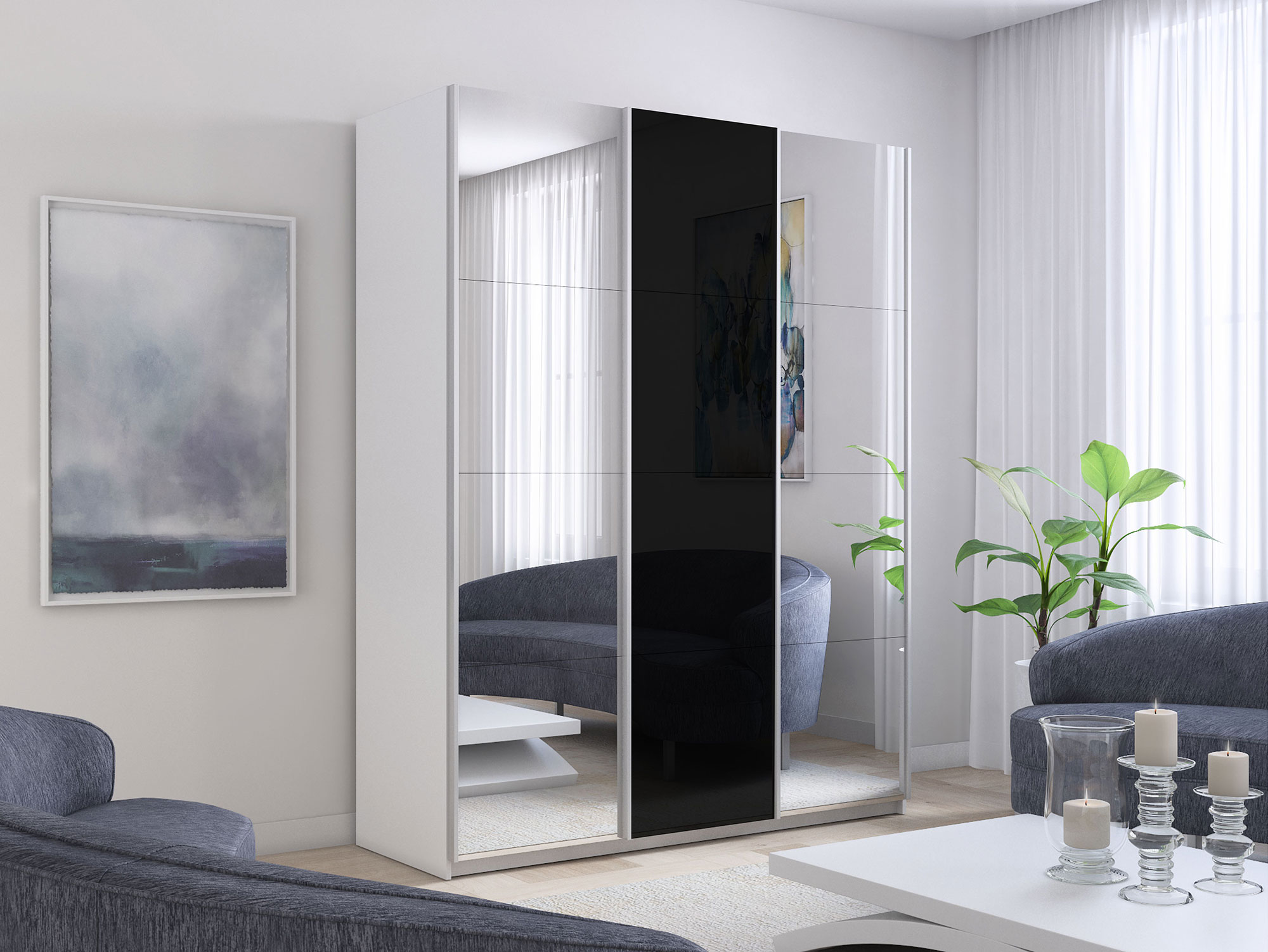 Шкаф-купе Прайм 3-х дверный 1800 Зеркало/Стекло Черное/Зеркало Белый Снег
