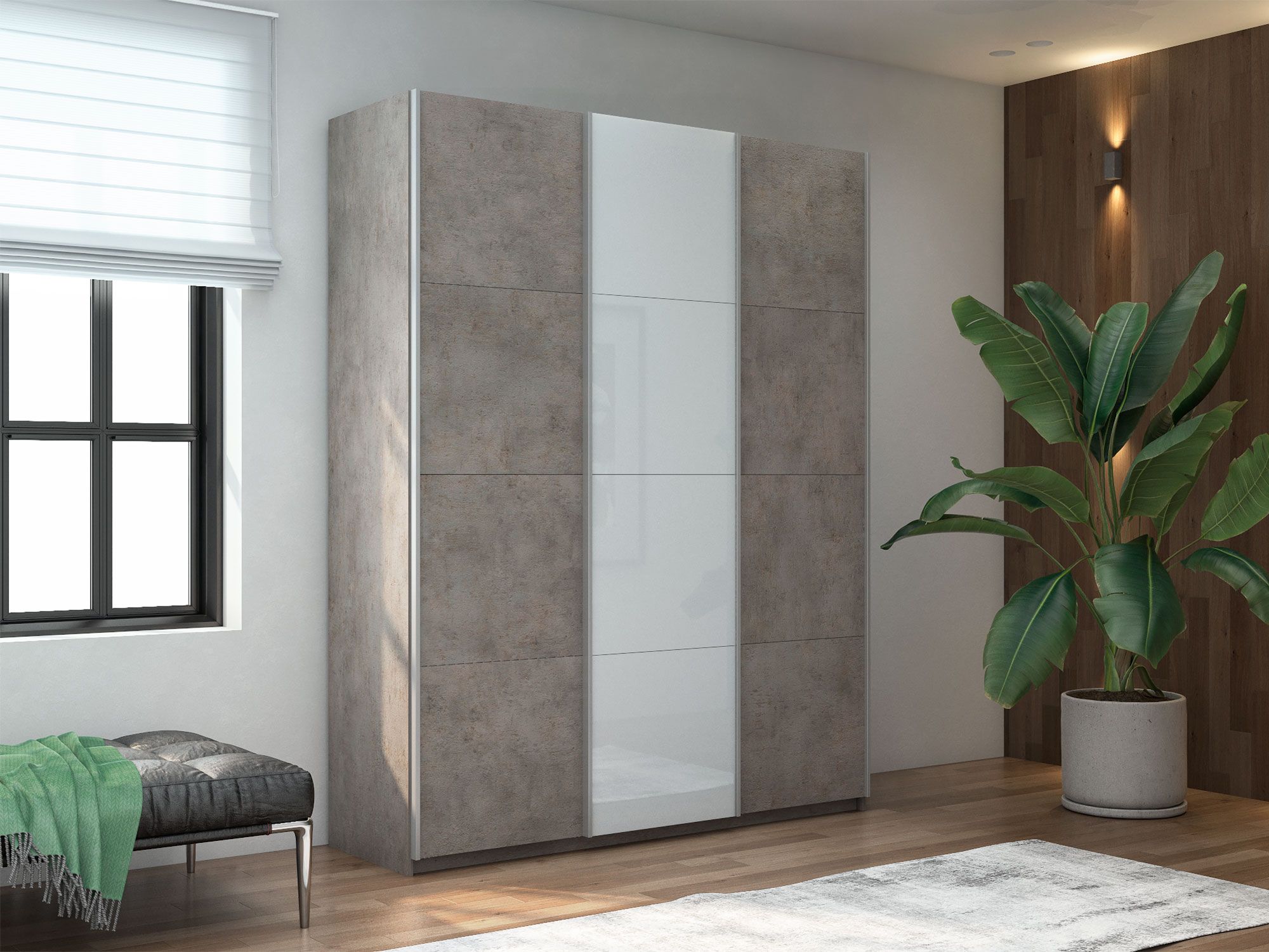 - Шкаф-купе Прайм Широкий 3-х дверный два ДСП/Стекло Белое Бетон